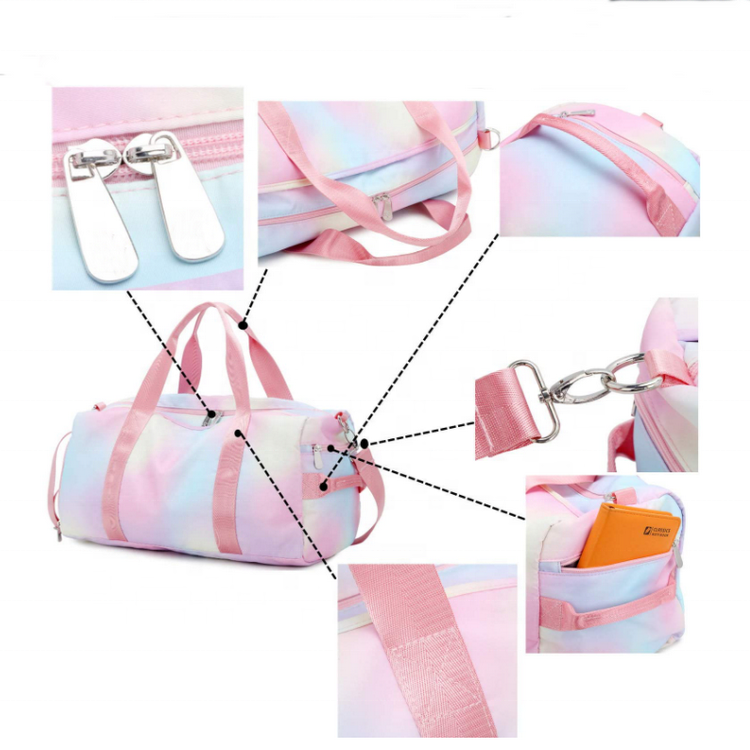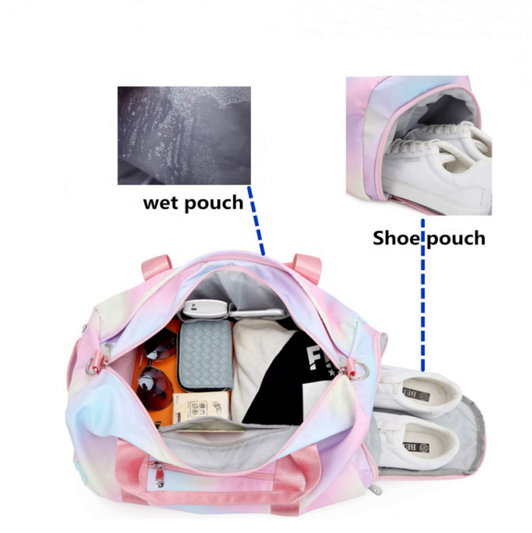 홈페이지 / 제품 / 여행 가방 / 더플 백 / 휴대용 사용자 정의 인쇄 로고 주말 밤새 수하물 해안 포켓 더플 백 화려한 무지개 크로스 바디 백 스포츠